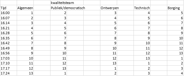 Iedere werkgroep maakt een rondje langs de vijf kwaliteitsteams. De teams zitten in verschillende break-out rooms en jullie als werkgroep wisselen steeds. Hieronder zien jullie hoe laat jullie waar worden verwacht.